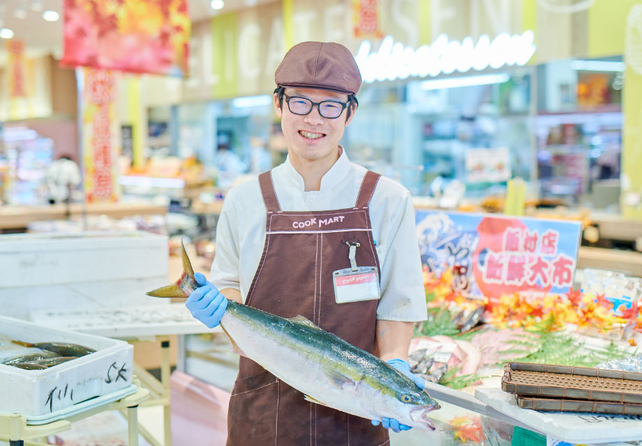 鮮魚チームはその名の通り魚を扱うチーム。クックマート独自の仕入れルートを開拓し、日本全国の有数な漁港から仕入れた様々な魚を、担当者たちが毎日捌き、調理して販売しています。鮮魚チームの合言葉は「毎日がアドベンチャー!」。お客さまのワクワク感を目指して、季節ごとに旬のお魚を並べるのはもちろん、目で見て楽しい尾頭付きのお造りや、料理の自由度が広がる裸売りの魚など、工夫を凝らした売り場が自慢です。また、対面販売にも力を入れており、お客さまのニーズをダイレクトにキャッチ。すぐさま商品づくりに反映することで、店舗ごとに個性あふれる鮮魚商品が並びます。