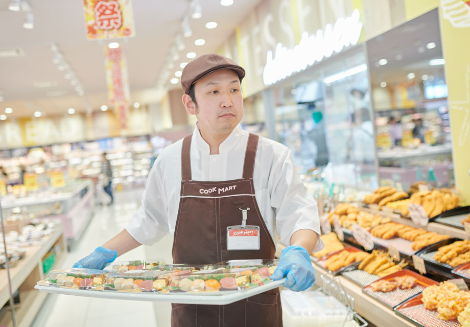 お弁当やお寿司、揚げ物、サラダ、和惣菜、洋食、中華などのお惣菜から、サンドウィッチやバーガーといったベーカリー商品まで、実に幅広い「食」を扱うのがクックマートのデリカベーカリーチームです。その特徴は圧倒的な品揃えでしょう。旬の食材をふんだんに使った様々なメニューは見た目にも華やかで、お昼時や夕方はいつも人だかりができています。メンバー全員が商品開発に携わっているので、毎日のように新商品が登場するのもお客さまの楽しみのひとつ。店内加工にこだわった“家庭では出せない家庭の味”は、毎日食べても飽きがこないと評判です。すべてのお客さまの「五感をトリコにする!」ことを目指して、日夜新しい食の探求に勤しんでいます。