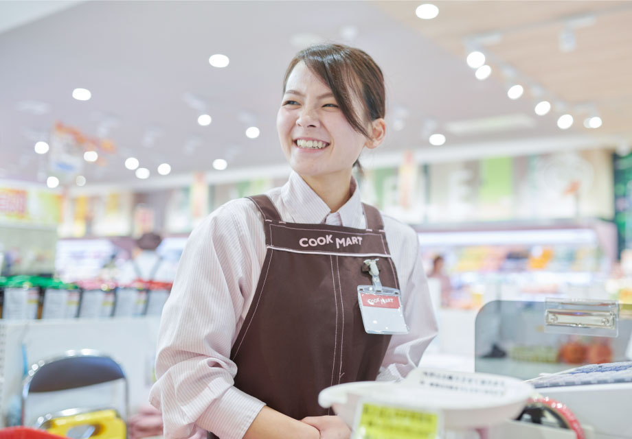 チェッカーチームは、レジ周り、サービス、接客など、お店の魅力と付加価値アップに取り組むチームです。他のスーパーには当たり前のように存在する細かい接客マニュアルが、クックマートにはありません。規定通りに働くのではなく、いかに心を込めた接客ができるのかに日々こだわっています。それが伝わるからか、多くのお客さまから「クックマートは接客がいい!」「レジ対応に感動した」などお褒めのお言葉をいただくことも少なくありません。自分自身がお客さまに喜ばれる存在になることを目指し、周りの人もハッピーにしていく。それを通してクックマートのファンを増やしていく。これがクックマートのチェッカーの重要な使命です。